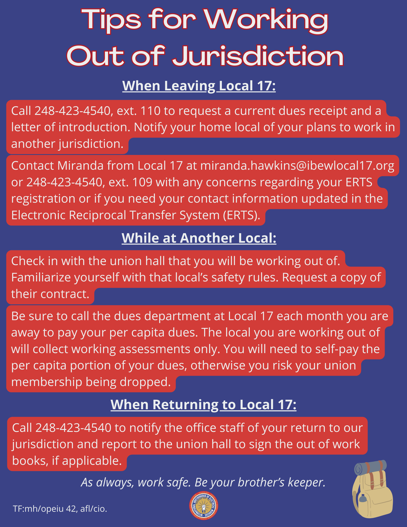 Local 17 still requires book signing in-person. We are now also requiring a letter of introduction from your home local (dated the month you are signing), as well as, a dues receipt, at the time of signing our books. Read More...